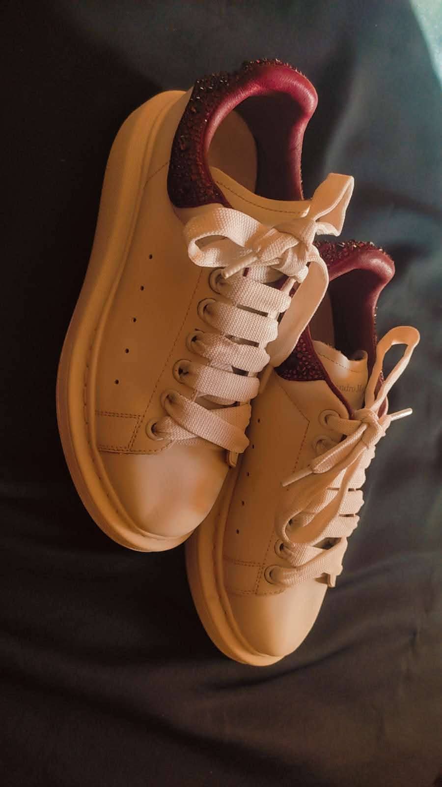 Elevate your style with our stunning pair of cream-colored sneakers adorned with dazzling red rhinestones! 💫 Perfect for those who want to add a touch of glamour to their everyday look. Handcrafted with care, these unique shoes blend comfort and fashion. Get ready to turn heads! 👟✨ Shop now for a statement piece that's all about you!